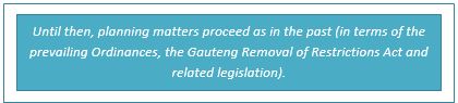 Spatial PlanningAs far as Johannesburg and Ekurhuleni are concerned, it is reported that the planning by-laws have been prepared in draft but have not been published for comment as yet. In the case of Johannesburg, it is foreseen that the existing Municipal Tribunal (a collection of municipal officials from various municipal divisions) will serve as the new Municipal Planning Tribunal as contemplated in SPLUMA, to decide relevant matters which are submitted in terms of the new by-law. There is no precise date of enactment in this regard, and the SAACPP will keep members informed accordingly.